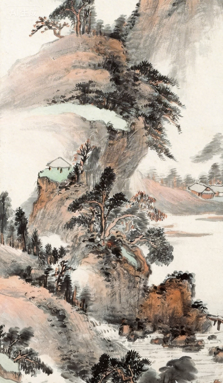 王蒙的“溪山雨意”本就以繁密的笔触、深邃的意境著称,萧俊贤在仿作中巧妙借鉴,又融入自身对山水的理解。画面里,山峦起伏,云雾缭绕,似真似幻,仿佛将观者带入了一个空灵悠远的仙境。树木郁郁葱葱,以细腻的笔触勾勒出枝叶的形态,展现出勃勃生机。溪流潺潺流淌,似在诉说着岁月的故事。